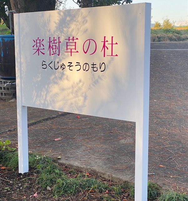 楽樹草の杜に建植しました由来説明サインの裏面に楽樹草の杜の文字入れです。散歩コースから見えるようにマーキングしました。