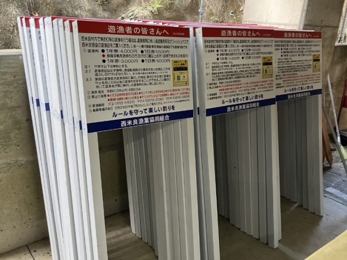 西米良漁業協同組合さまの看板41枚納入させていただきました。遊漁者さまへの遊漁料のお知らせ(パスカード)等の案内や詳しい遊漁のルール等が提示されてます。各漁場に設置されます。