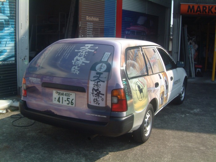 宮崎県、高千穂町の神楽酒造(株)様の、営業車です。安井株式会社とのジョイントです。スコッチカルプリントのラッピング車です西日本を自社のコマーシャルカーで走行されてます。good アイデア、リア,及び両サイドのガラス面はワンウエイビジョンのフィルム施工です。祈、安全運転。